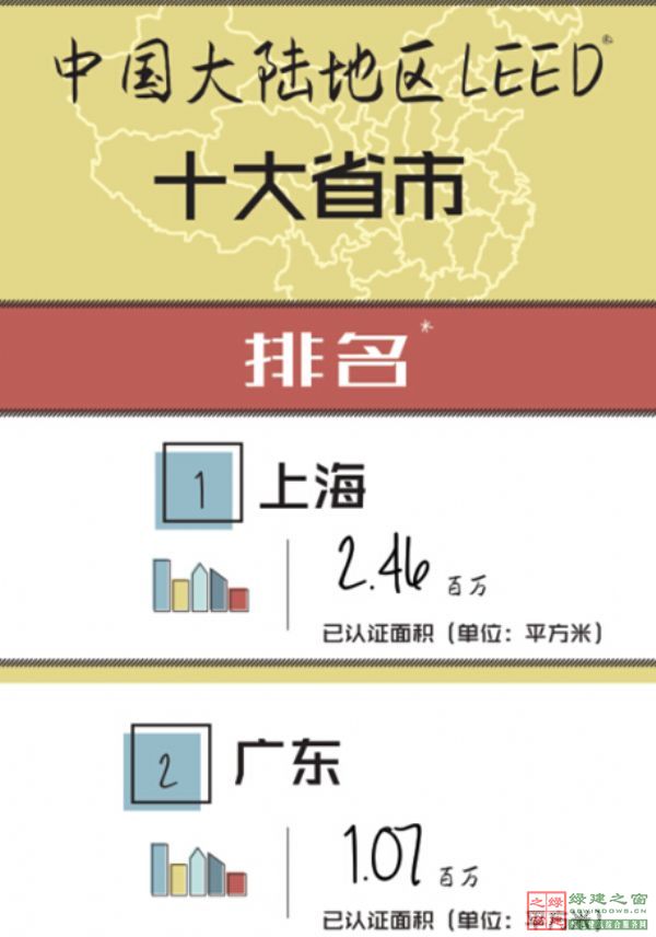 中國大陸地區共有732個總認證面積達2,670萬平方米的項目在參與LEED綠色建筑評價系統。